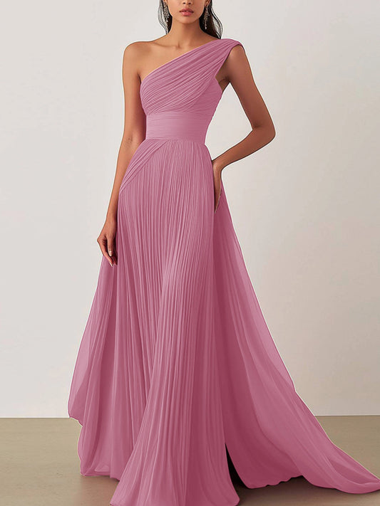 Prom Formal Pleated Dress Rose Color One-Shoulder Floor-Length Dress