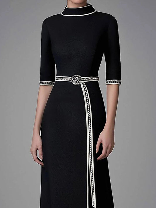 Elegant Black Slit Dress Funnel Neck Half-Sleeve Maxi Dress