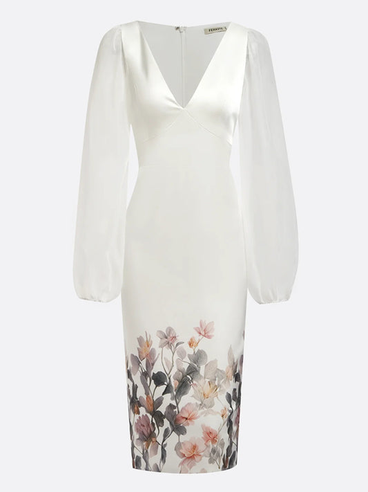 Floral V Neck Balloon Sleeve Midi Sheath Satin Dress