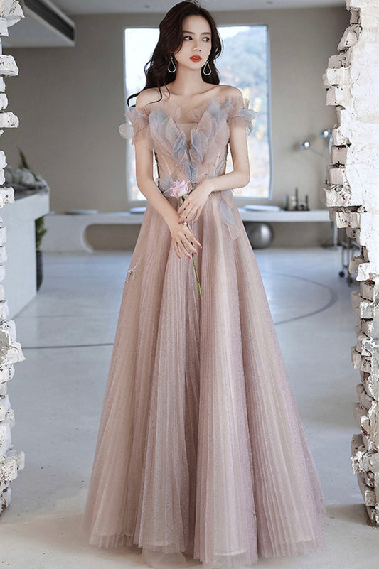 Pink Tulle Long A-Line Prom Dress, Off the Shoulder Evening Party Dress