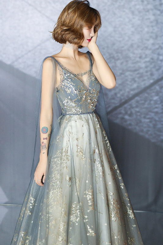 Gray V-Neck Tulle Sequins Long Prom Dress, A-Line Formal Evening Dress
