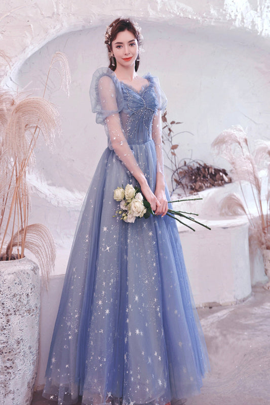 Blue Tulle Long Sleeve Prom Dress, A-Line Long Sleeve Tulle Evening Party Dress