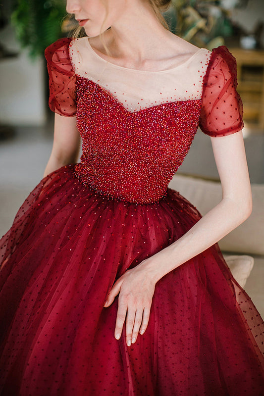 Burgundy Tulle Long Prom Dress with Sequins, A-Line Formal Evening Dress