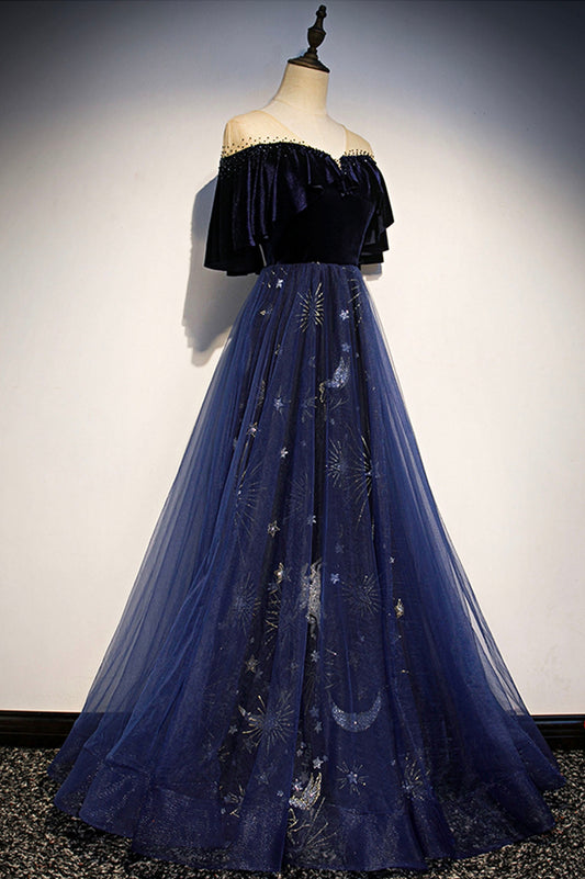 Blue Velvet Tulle Long Prom Dress, A-Line Blue Evening Party Dress
