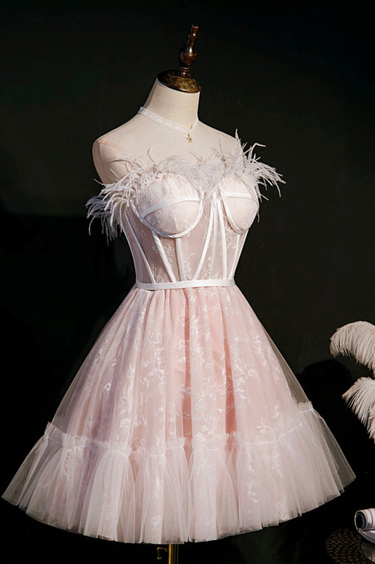 Pink A-Line Tulle Short Prom Dress with Feather, Pink Strapless Party Dress