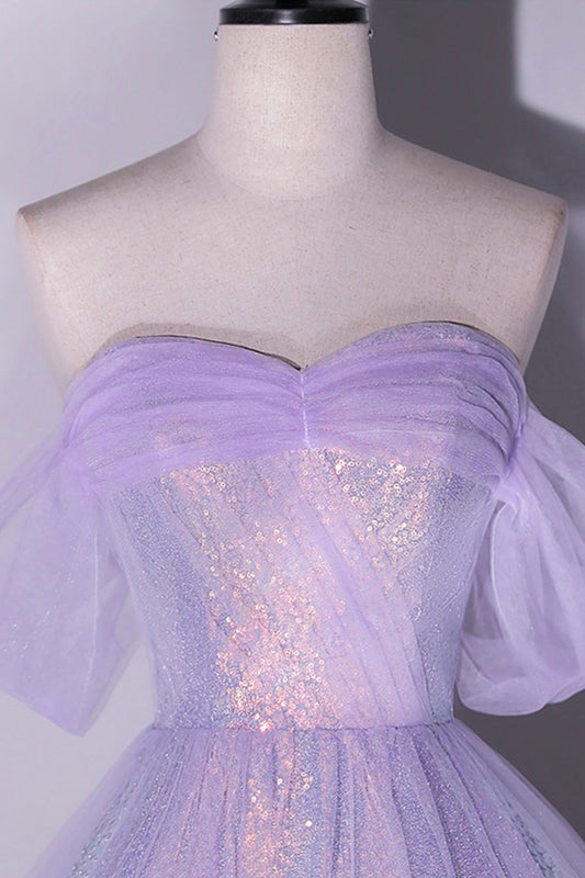 Purple Sequins Long A-Line Prom Dress, Off the Shoulder Evening Party Dress