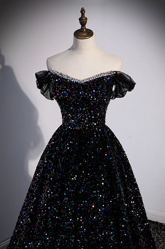 Black Off the Shoulder Beaded Long Formal Dress, Black Shiny Sequins Evening Dress