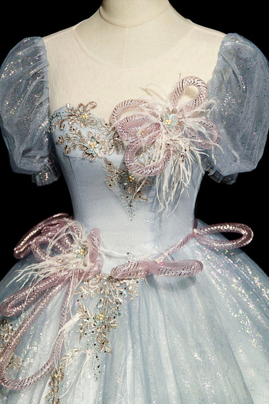 Blue Shiny Tulle Long Prom Dress with Sequins, A-Line Short Sleeve Party Dress