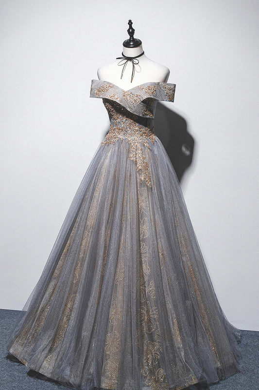 Gray Tulle Sequins Long Prom Dress, Off Shoulder Evening Dress
