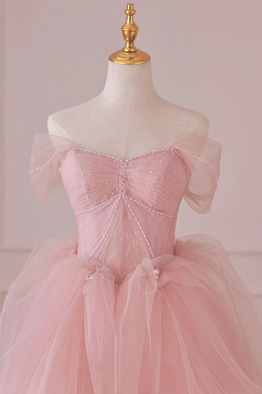 Pink Tulle Lace Long Formal Dress, A-Line Off Shoulder Pink Prom Dress
