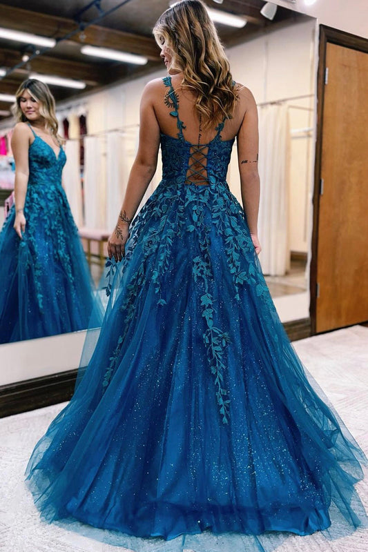 Blue V-Neck Lace Long Prom Dress, A-Line Blue Evening Dress