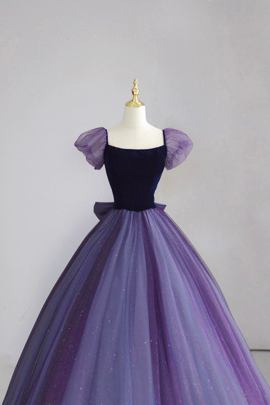 Purple Tulle Long Prom Dress with Velvet, Cute A-Line Short Sleeve Evening Dress