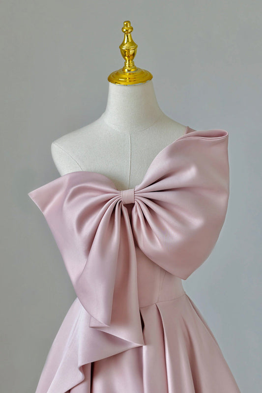 Pink Satin Long Prom Dress with Bow, One Shoulder Formal Evening Dress