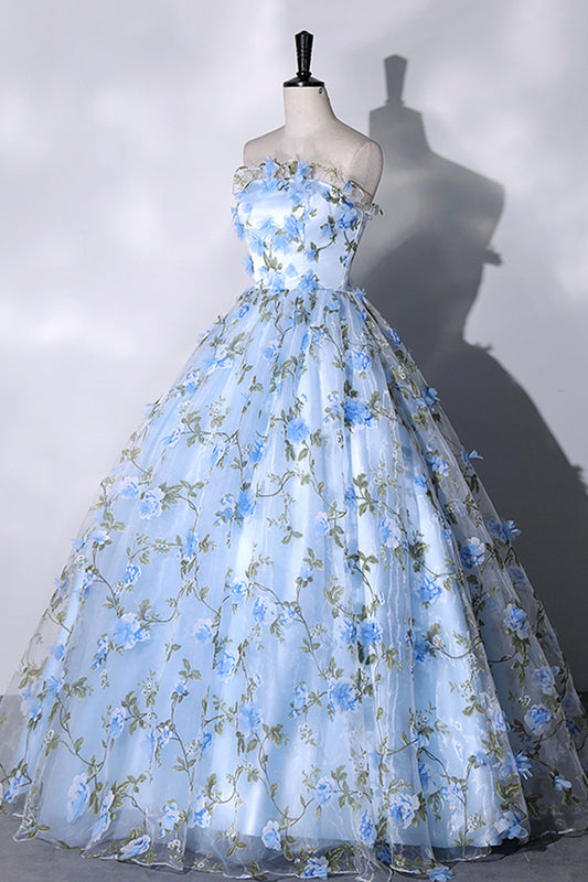 Blue Strapless Tulle Long Prom Dress, A-Line Evening Dress Party Dress
