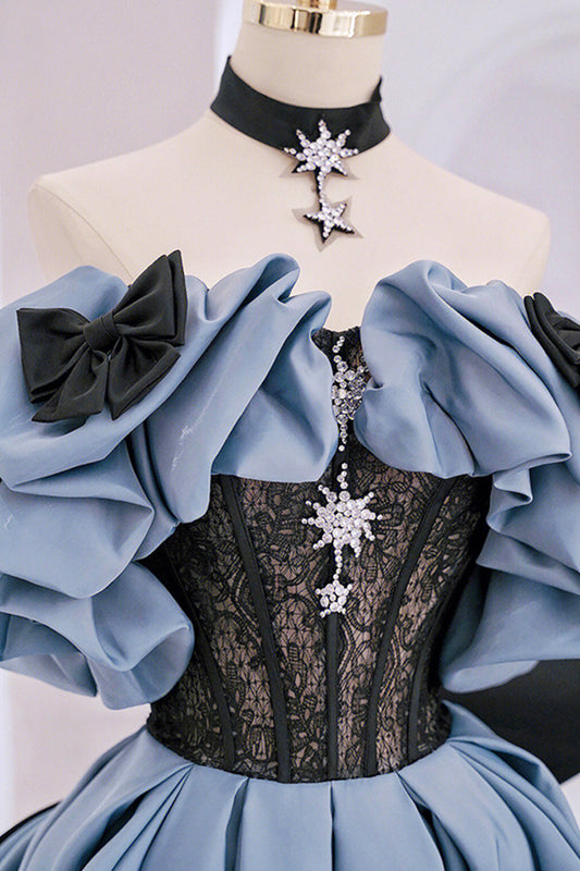Blue Satin Lace Long Prom Dress, Off Shoulder Evening Party Dress