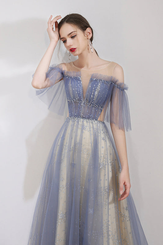 Beautiful Tulle Short Sleeves Formal Dress with Lace, Lovely Blue Long Prom Dress