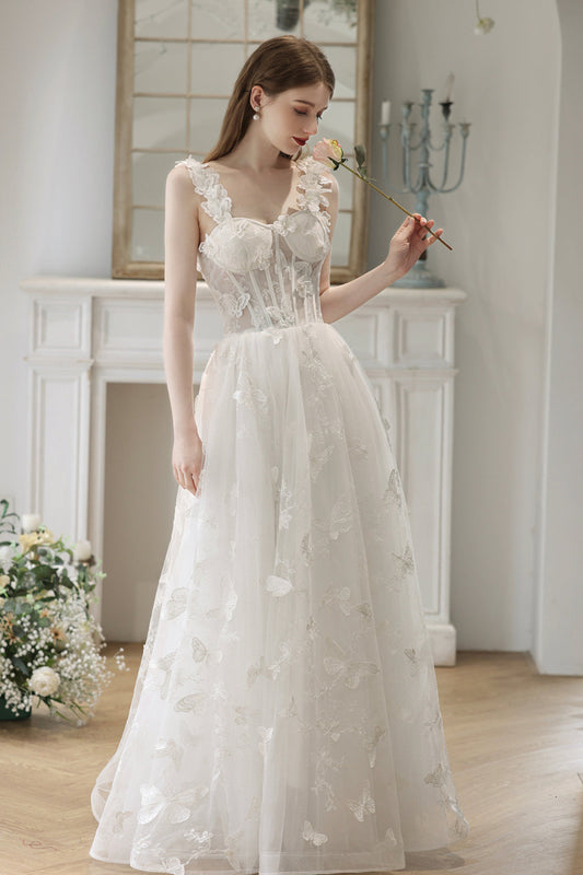 White Lace with Butterflies Long Formal Dress, White Prom Dress