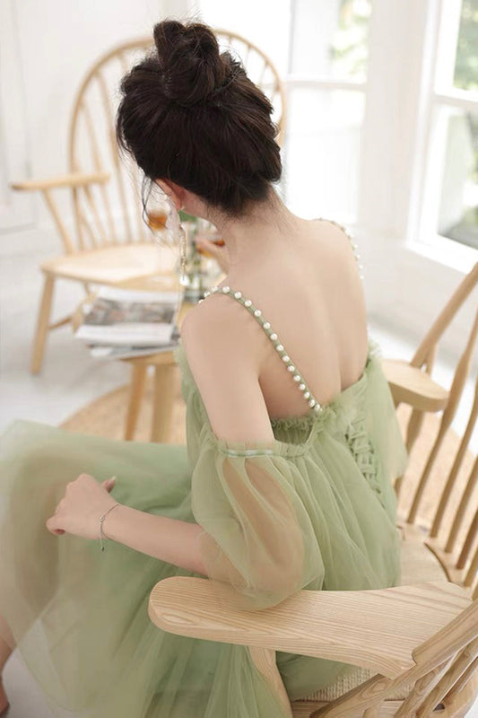 Green Spaghetti Strap Tulle Short Prom Dress, Green A-Line Homecoming Dress