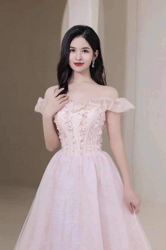 Pink Tulle Beaded Short Prom Dress, Pink Off Shoulder Evening Party Dress