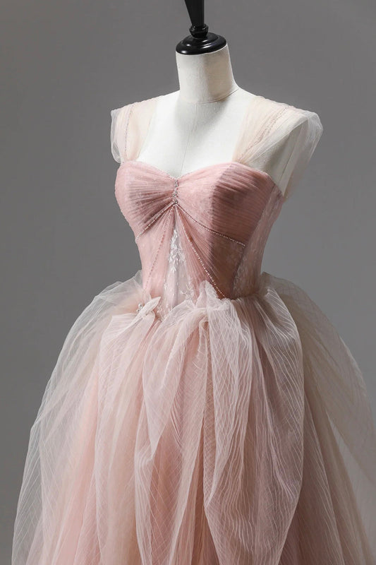 Pink Spaghetti Strap Tulle Long Prom Dress, Beautiful A-Line Formal Sweet 16 Dress