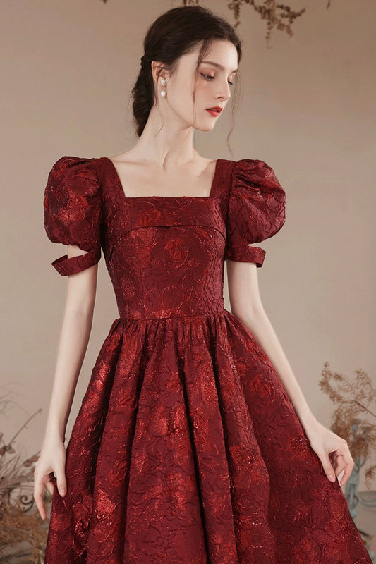Burgundy Short Sleeve Tea Length Prom Dress, Lovely A-Line Evening Party Dress