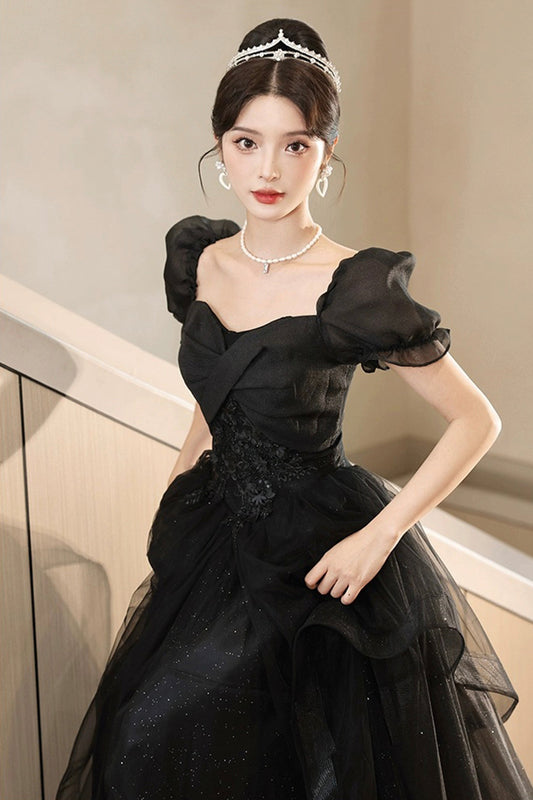Black Tulle Lace Short Sleeve Floor Length Prom Dress, Black A-Line Evening Party Dress