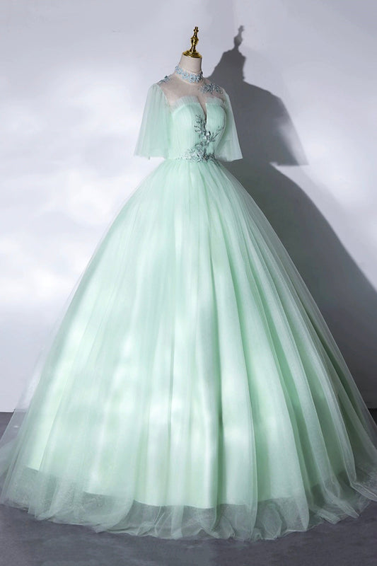 Green Tulle Floor Length Prom Dress, A-Line Long Sleeve Evening Party Dress
