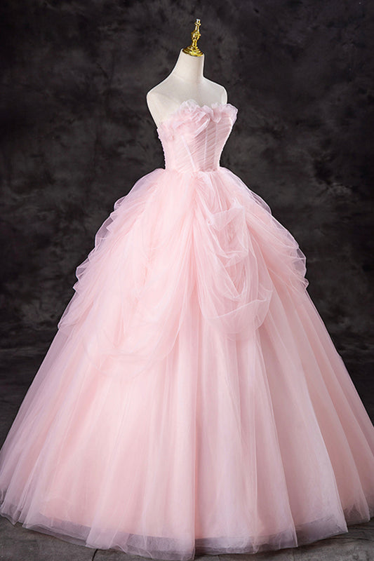 Pink Strapless Tulle Floor Length Prom Dress, Lovely A-Line Evening Party Dress