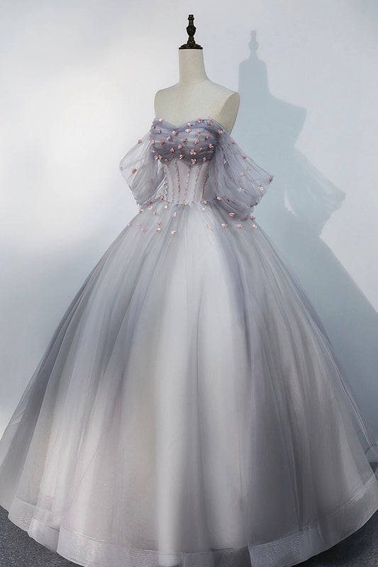 Gray Tulle Floor Length Prom Dress, Off the Shoulder Evening Party Dress