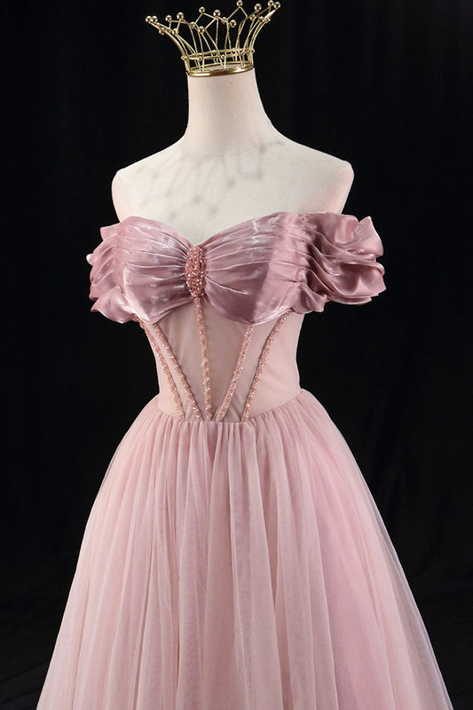 Off the Shoulder Sweetheart Beaded Tulle Long Prom Dress, A-Line Pink Evening Dress