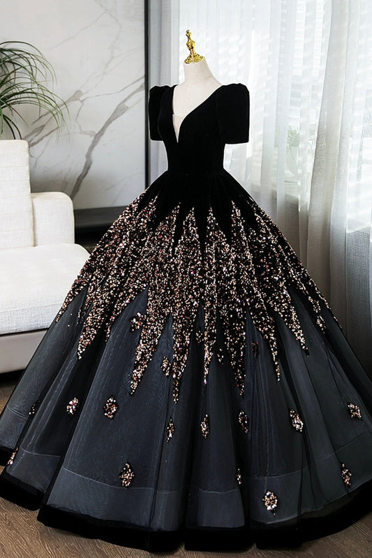 Elegant V-Neck Velvet and Sequins Floor Length Prom Dress, Black Short Sleeve Formal Dress