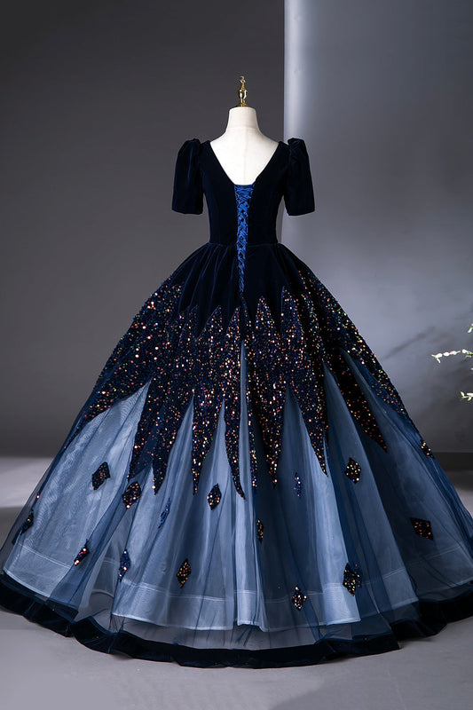 Blue V-Neck Velvet and Sequins Floor Length Prom Dress, Elegant Short Sleeve Formal Dress