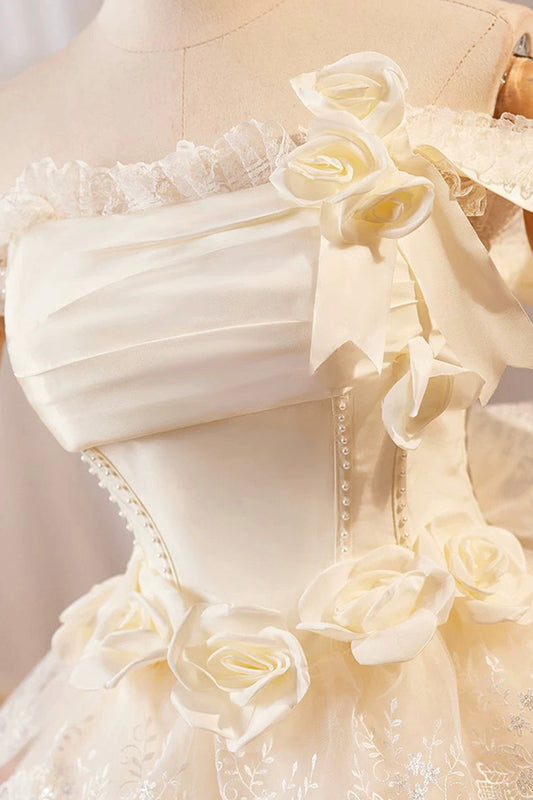 White Satin Lace A-Line Prom Dress, Lovely Off the Shoulder Evening Party Dress