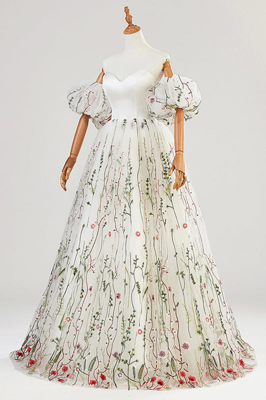 White Tulle Lace Long Prom Dress, A-Line Strapless Evening Party Dress