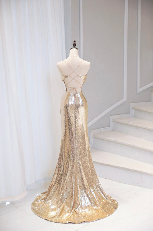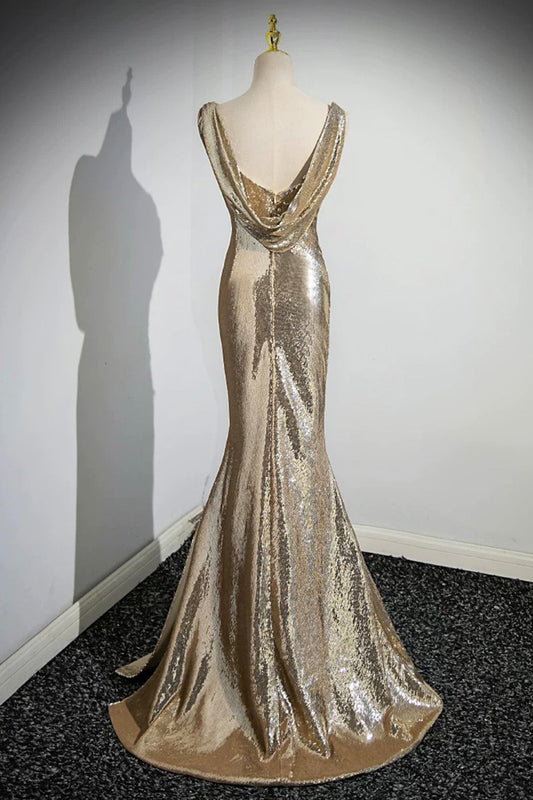 Mermaid Sequins Long Prom Dress, Gold Backless Evening Party Dress
