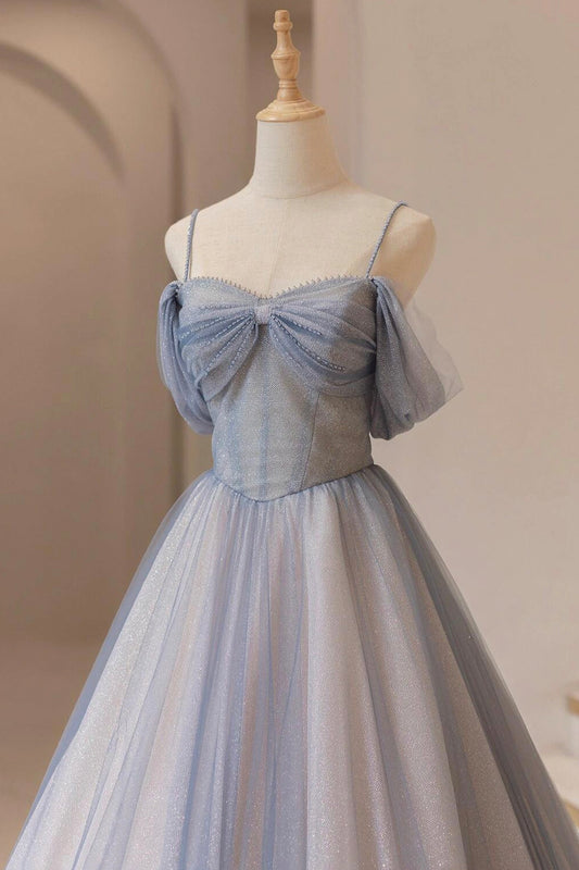 Gray Blue Spaghetti Strap Tulle Floor Length Prom Dress, A-Line Evening Party Dress