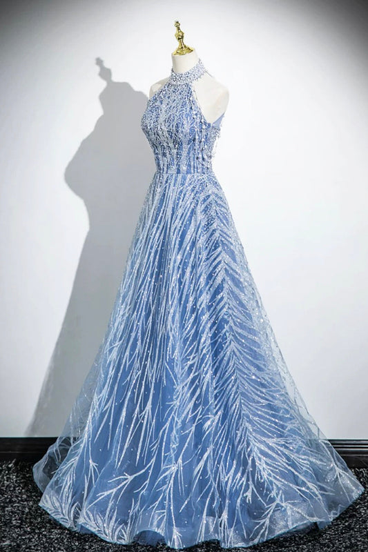 Elegant Tulle Sequins Floor Length Prom Dress, Blue Halter A-Line Evening Dress