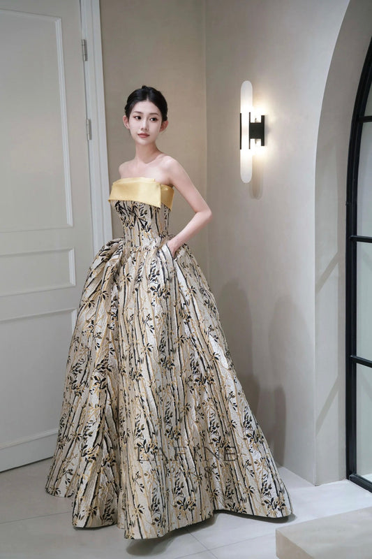 Beautiful Bamboo Leaf Print Pattern Strapless Prom Dress, A-Line Backless Evening Party Dress