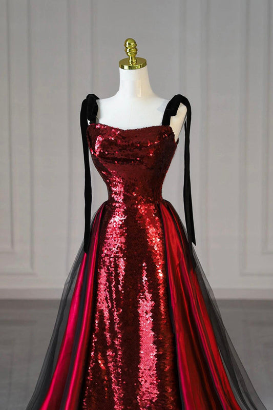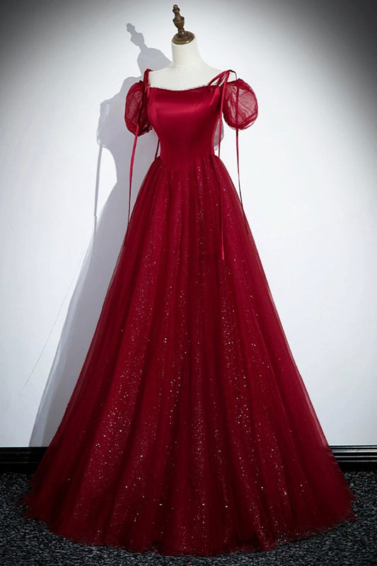 Burgundy Tulle Sequins Long Prom Dress, Shiny A-Line Evening Party Dress