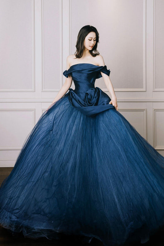Navy Velvet and Tulle Long Prom Dress, Elegant Off the Shoulder Party Dress