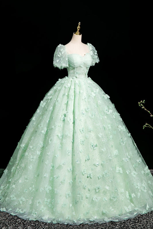 Green Tulle Butterfly Long A-Line Prom Dress, Beautiful Short Sleeve Evening Dress