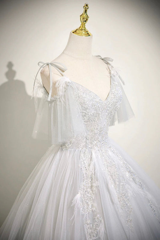 White V-Neck Tulle Long Prom Dress, Beautiful A-Line Evening Dress