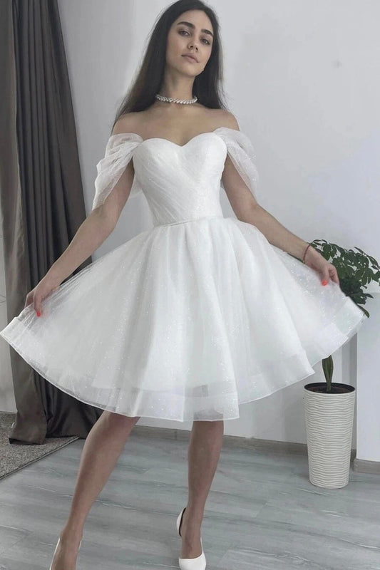White Tulle Short A-Line Prom Dress, Lovely Off the Shoulder Party Dress