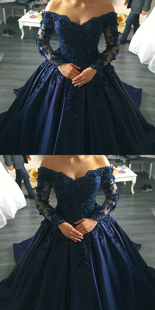 Navy Blue Lace Appliques Long Sleeves Ball Gowns Wedding Dresses Off Shoulder cg1431