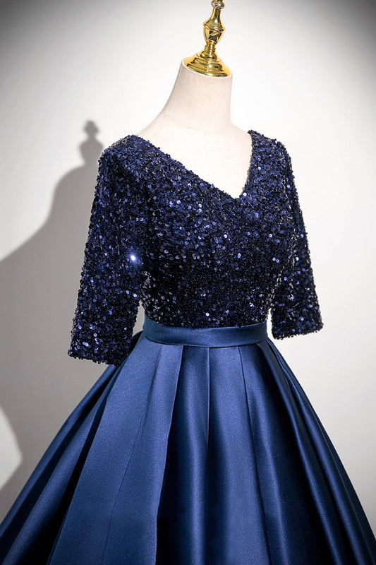 Navy Satin Sequins Long Prom Dress, V-Neck 1/2 Sleeve Evening Party Dress