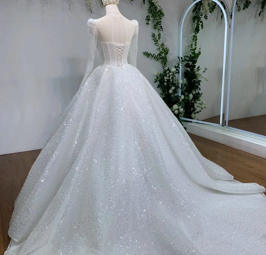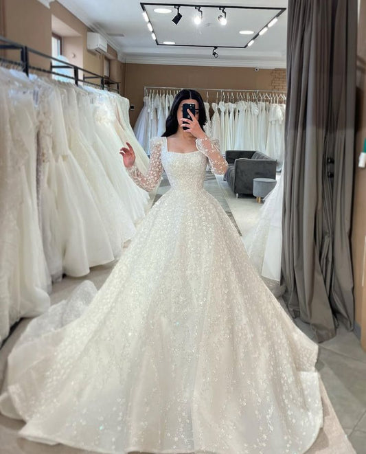 Luxury A-line Wedding Dress Square Neck Long Sleeves Lace Sequin Bridal Gown cg26038