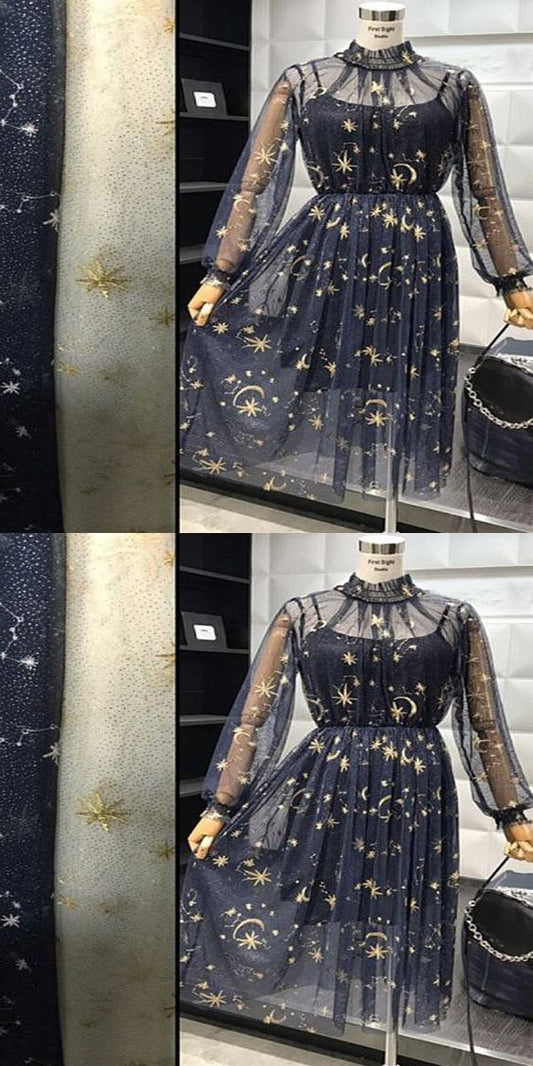 See Through Dark Navy homecoming Dress A-Line High Neck Dresses With Long Sleeves cg3654