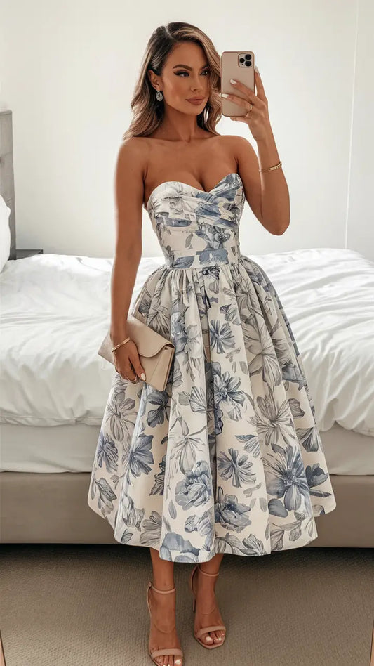 Elegant Wedding Guest Outfit Ball Gown Blue Floral Formal Night Dresses Summer Tea Length Wedding Guest Dresses DP769