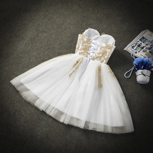 Cute White Tulle Party Dress with Gold Applique homecoming Dresses cg9831