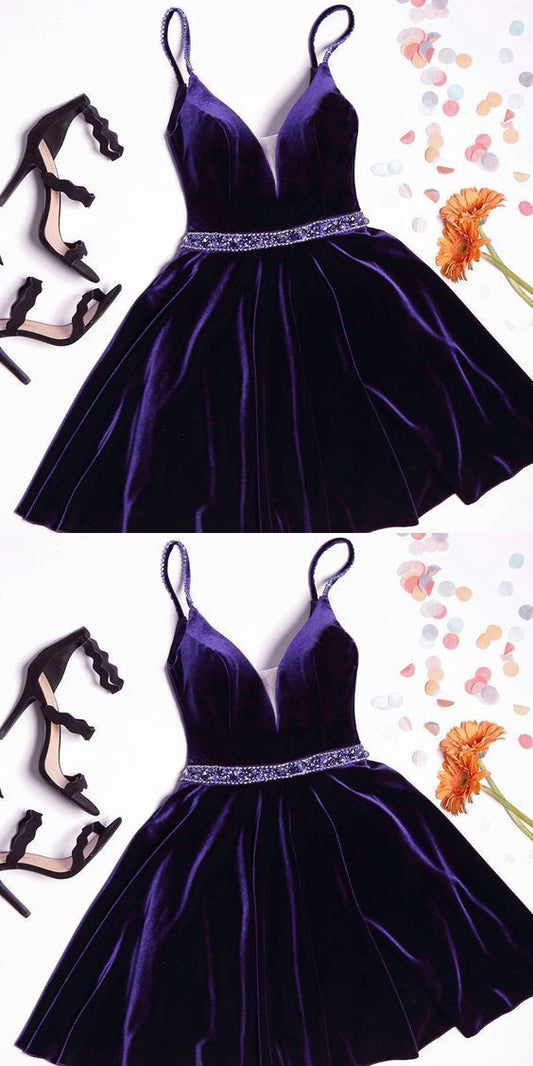 Cute A Line V Neck Open Back Velvet Burgundy Short Homecoming Dress cg231